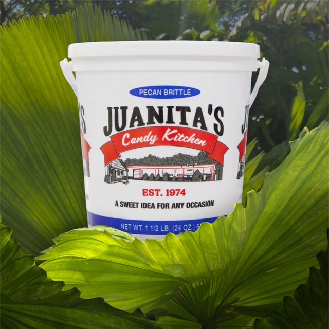 Indulge in Juanita's Candy Kitchen's handmade Pecan Brittle! Perfect for gifting or treating yourself, this thin and nut-filled brittle is made without preservatives. Available in 1 1/2 LB buckets. Get yours today!